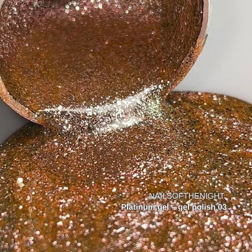 NAILSOFTHENIGHT Platinum gel – gel polish — design gel with incredibly dense metal base for nails, unsurpassed autumn glow and shine Autumn-Winter 2024: – contains medium particles of metal base, which give a metallic shine to your manicure; – covers the entire nail plate with a thin layer without defects and gaps; – medium consistency; – ideal for drawing small designs, thin lines or even for a classic French manicure. Application technology: degrease the nail plate; apply NAILSOFTHEDAY DEHYDRATOR dehydrator; then NAILSOFTHEDAY ULTRABOND ; make an elastic rubber base pad and polymerize; evenly distribute NAILSOFTHENIGHT Platinum gel - gel polish and carefully level it. We recommend covering with No stress top no wipe. Polymerization: UV – 120 seconds, LED – 60 seconds. Be bright with NAILSOFTHENIGHT!)