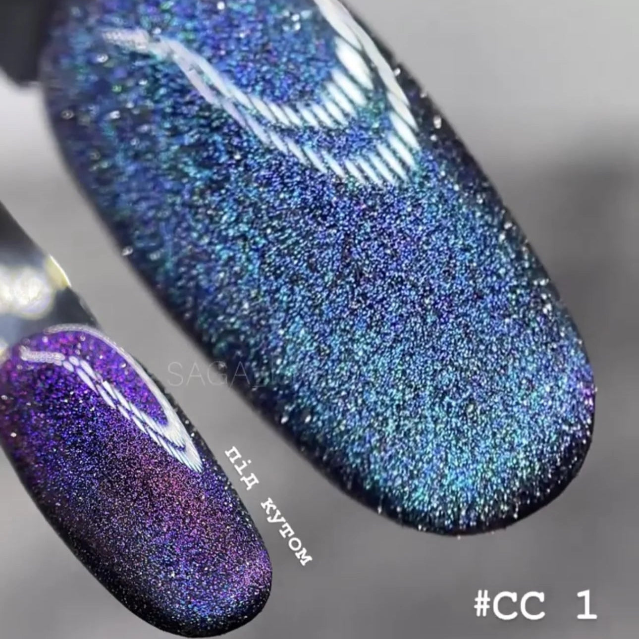 The "cat's eye" effect and reflective particles - a magical combination! This idea is very vividly realized in gel-lacquers Saga Professional Cat Chameleon (Saga Professional Cat Chameleon). They have a medium dense texture, so they look best on a dark substrate (black gel-lacquer). Saga Professional Cat Chameleon can be applied with or without a magnet to create a shimmering, shimmering chameleon glare. Both options showcase the most striking visual features of the decorative coatings and their amazing sparkling beauty.