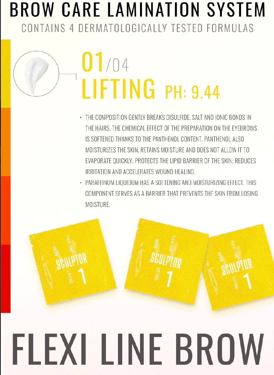 LIFTING is 1 component for eyebrow lamination in the FLEXI LINE BROW system. The product, which has a creamy consistency, gently destroys disulfide, salt and ionic bonds in the hairs, and creates a new direction for them. The formula of the preparation for llami with pH 9.44 is enriched with special components, thanks to which it does not damage the epidermis. Panthenol in the composition softens the effect of chemical components on the eyebrows, protects the lipid barrier of the skin and retains moisture in it. This ingredient also reduces irritation and accelerates the healing of the epidermis, taking care of its health. The mineral oil in the composition performs the functions of moisturizing and softening the skin.